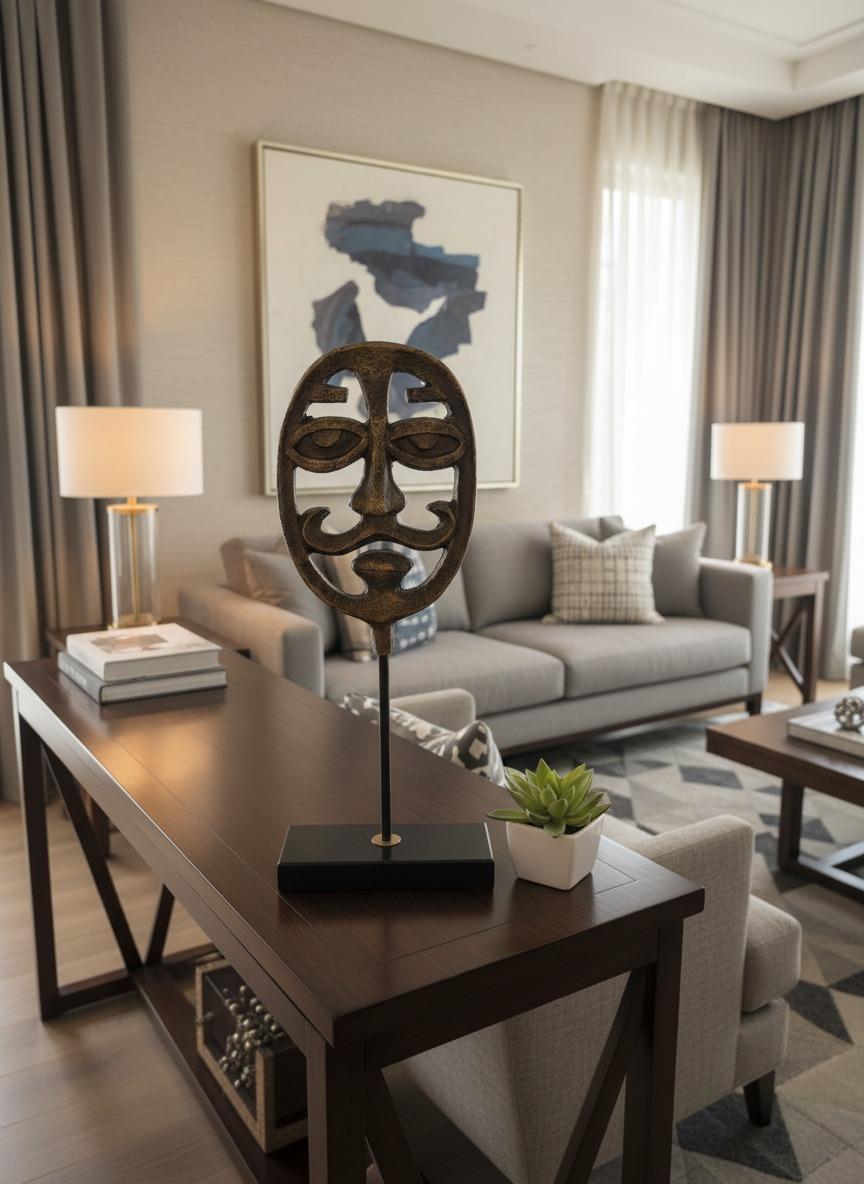 Cette pièce captivante, rend un vibrant hommage aux riches traditions de l’art tribal. Élégamment posé sur un élégant support en métal foncé avec une base noire raffinée, il incarne un mélange harmonieux de signification historique et de design contemporain. Les détails complexes et les caractéristiques distinctives du masque, tels que les yeux expressifs et les marques faciales, invitent à la contemplation et ajoutent une touche de mystère et de sophistication à tout espace. Plus qu’un simple objet de décoration, cette pièce est un sujet de conversation idéal pour insuffler à votre maison ou votre bureau une touche d’héritage mondial et une touche artistique.