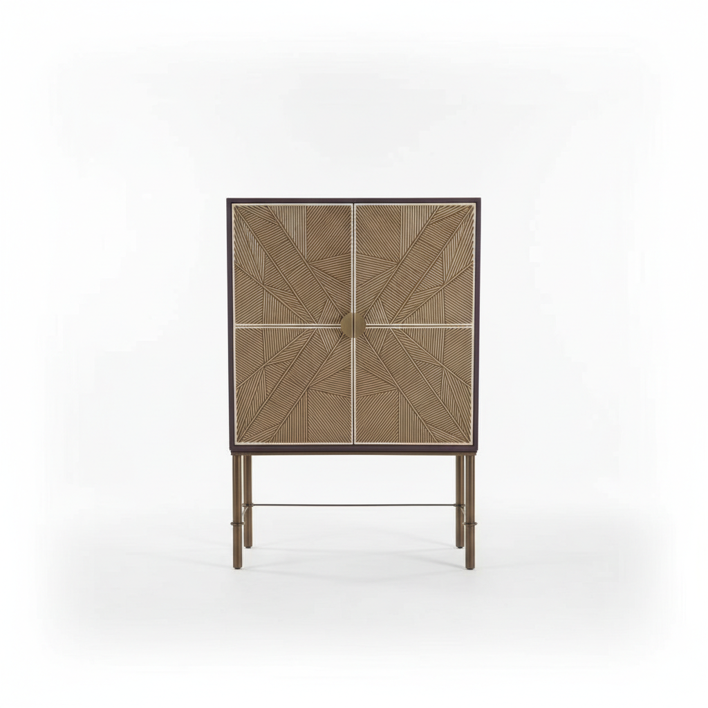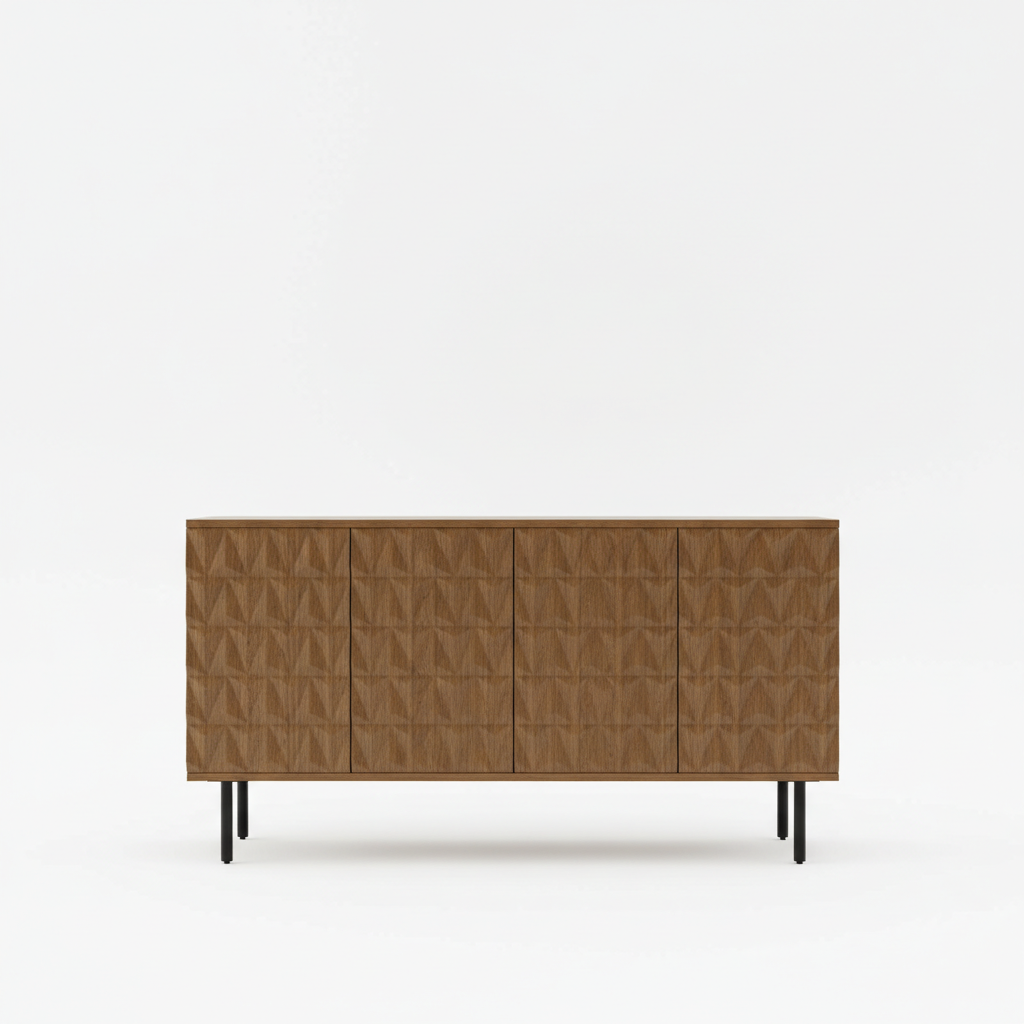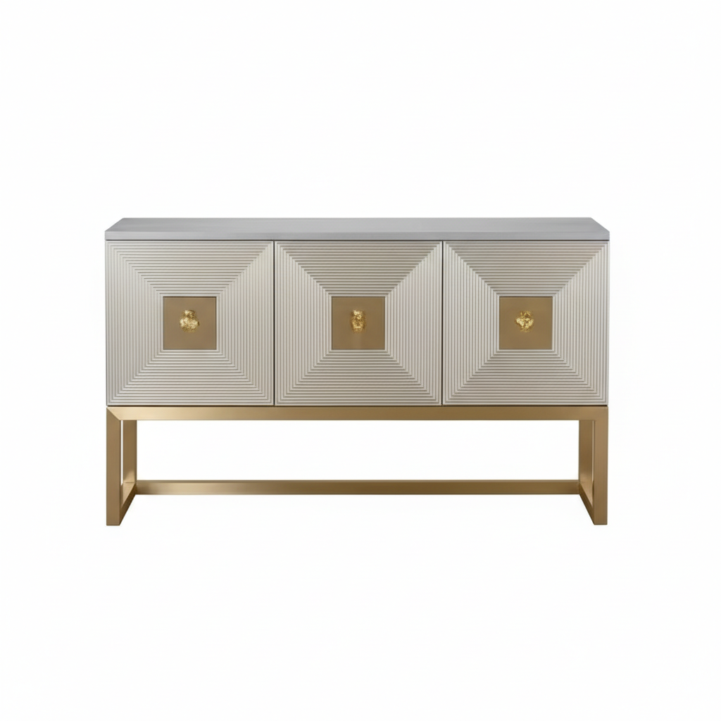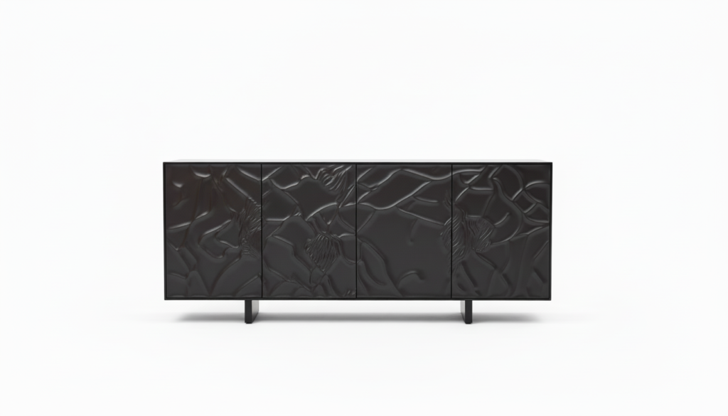 Alliant modernité et raffinement, ce buffet semi-circulaire est une pièce maîtresse de décoration. Sa façade blanche ornée de motifs subtils de feuillage apporte une touche artistique et contemporaine, tandis que son plateau noir contraste avec élégance. Son piètement métallique fin et robuste assure stabilité et légèreté visuelle. Idéal pour un salon, une salle à manger ou un hall d’entrée, il offre un espace de rangement pratique tout en sublimant votre intérieur.