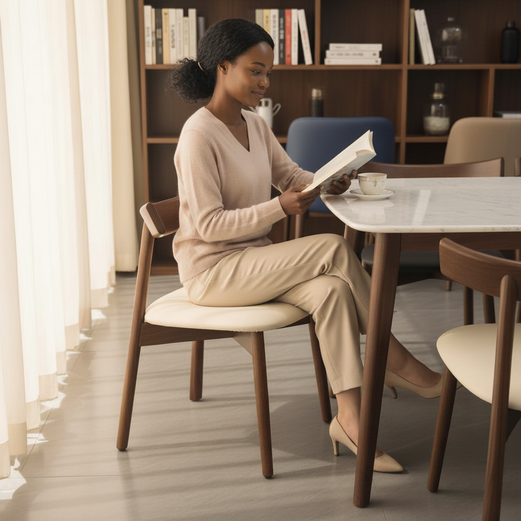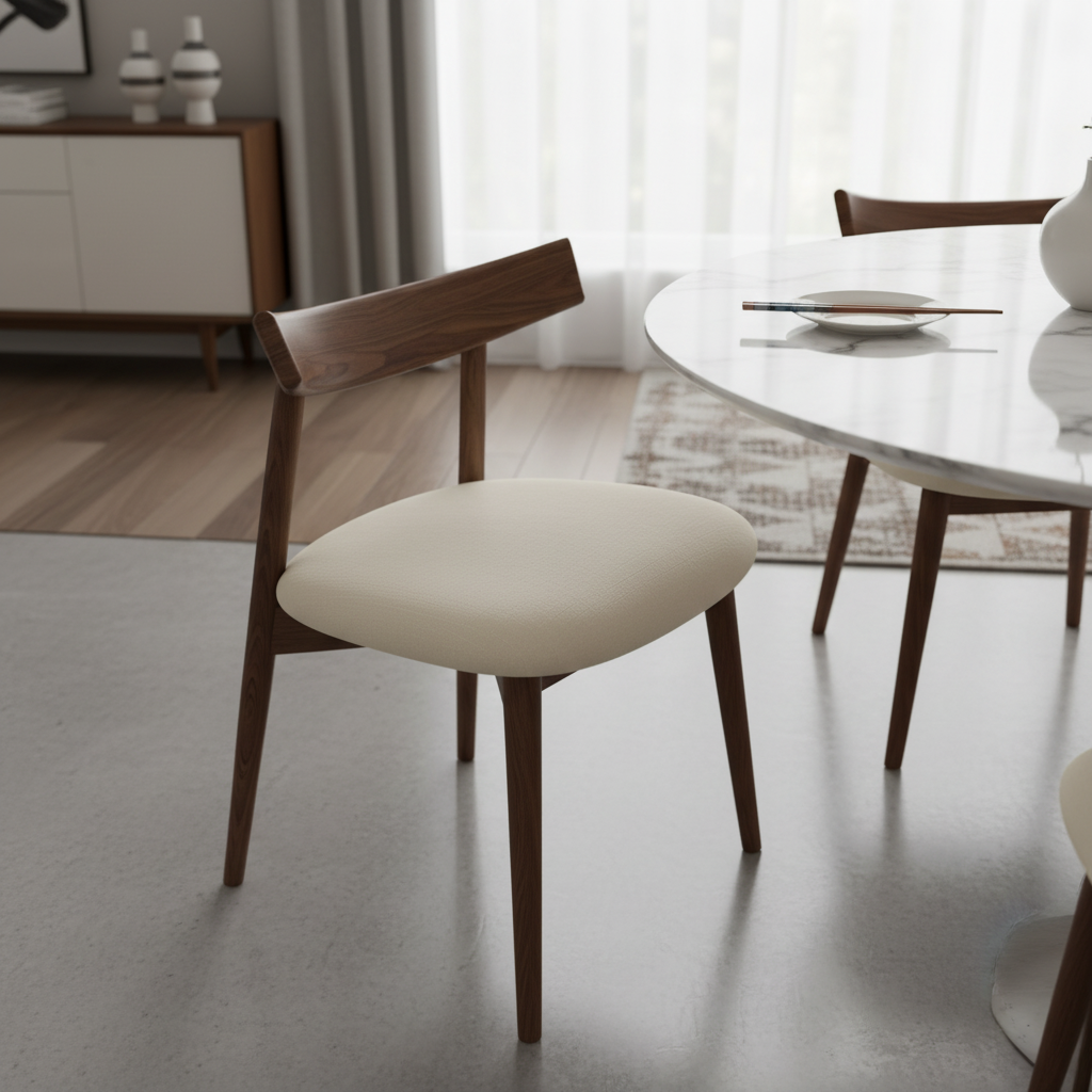 Chaise au design moderne et raffiné, conçue avec une structure en bois massif finition naturelle. Son assise rembourrée en tissu crème, réalisée avec une mousse haute résilience, garantit un confort durable. Les pieds triangulaires apportent une touche contemporaine, tandis que le dossier et les accoudoirs incurvés assurent un excellent maintien ergonomique. Polyvalente, la chaise Tosca s’intègre aussi bien dans une salle à manger classique que contemporaine.