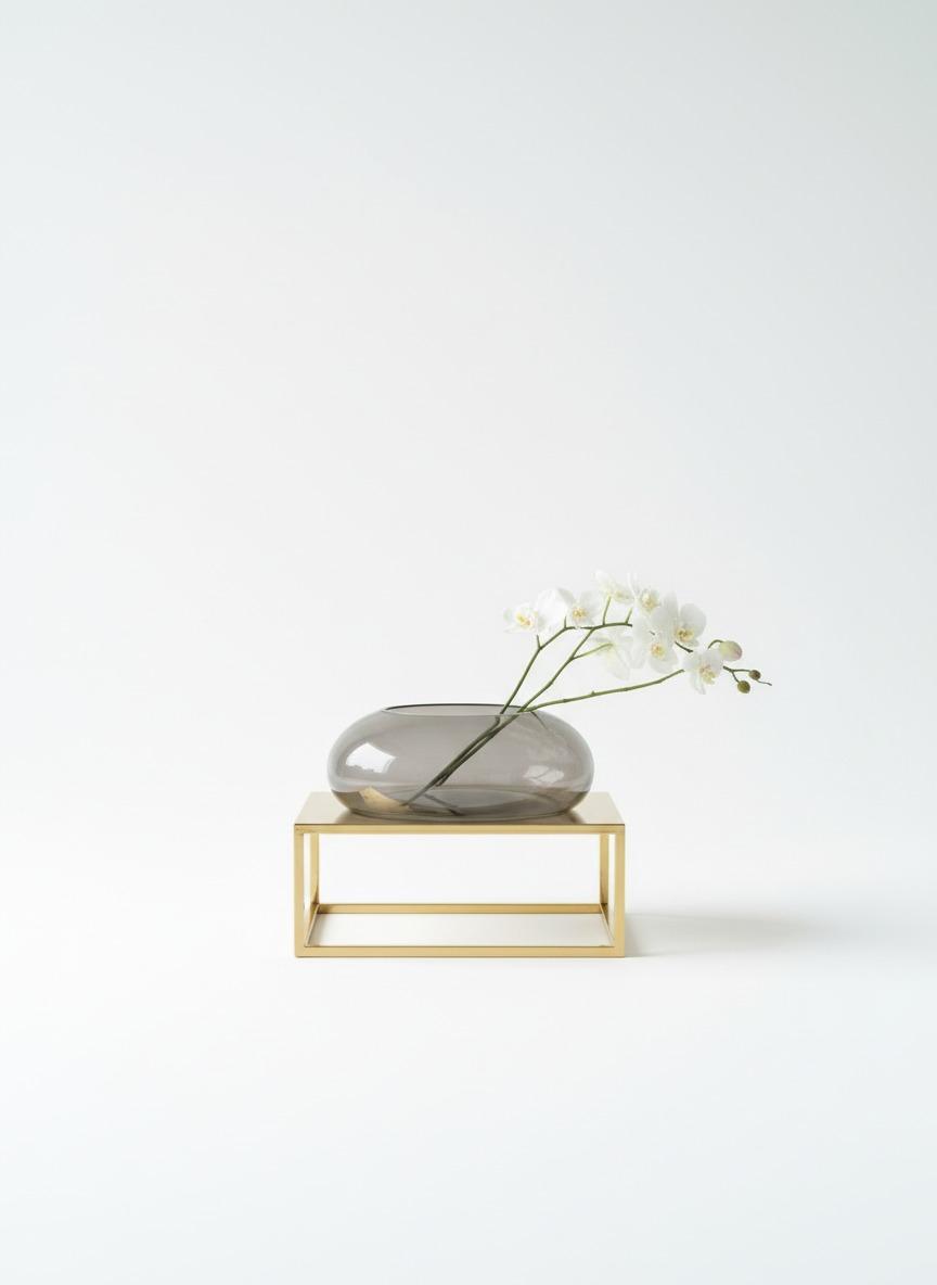 L’Éclipse Dorée est une rencontre subtile entre légèreté et structure. Un vase en verre fumé, délicatement arrondi comme une goutte figée, repose sur une base cubique dorée au design aérien. Ce contraste entre la transparence éthérée et la rigueur métallique crée une harmonie visuelle d’une élégance rare. Parfait pour sublimer une orchidée ou une fleur unique.