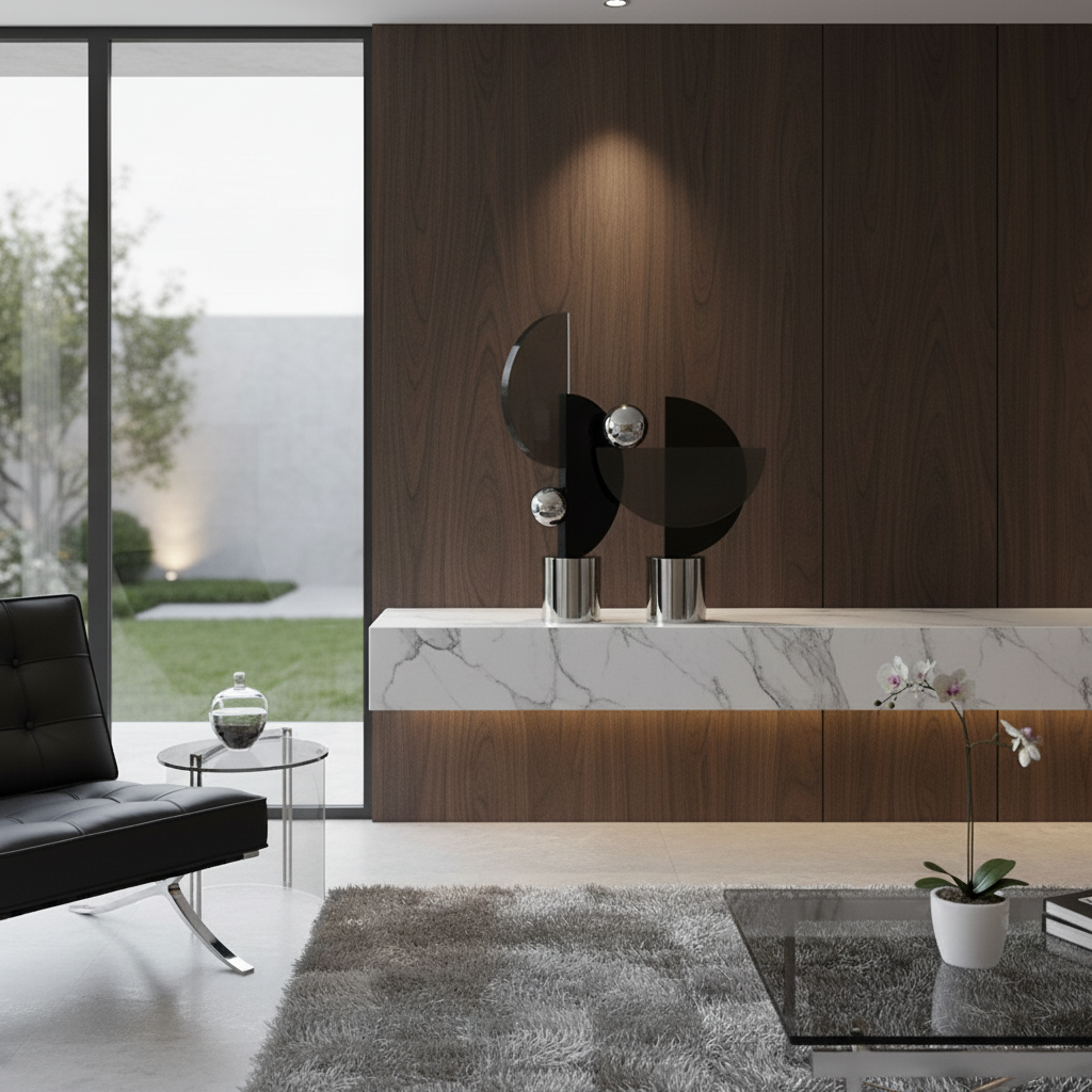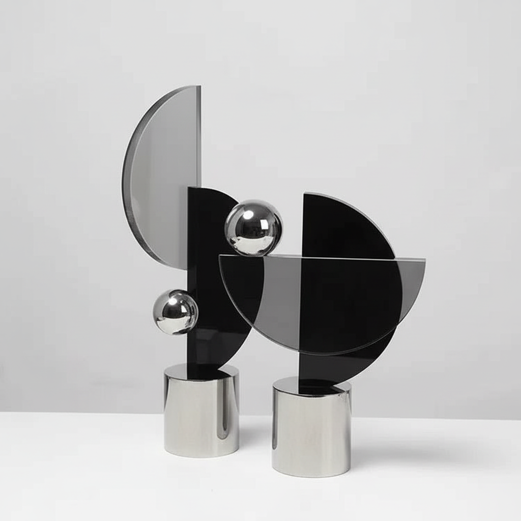 Paire de sculptures abstraites combinant formes géométriques en métal et acrylique, apportant une touche contemporaine, élégante et artistique à tout intérieur.