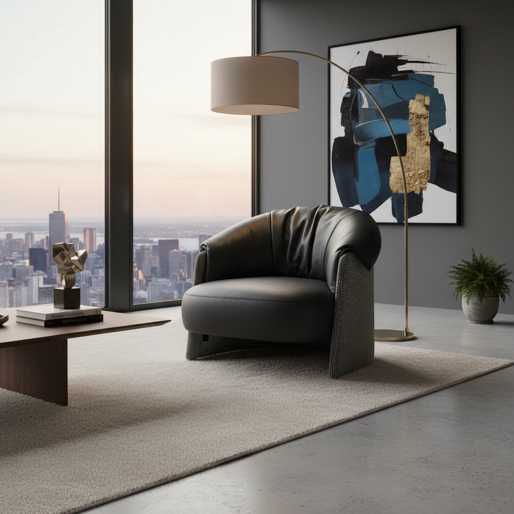 Fauteuil au design moderne et sophistiqué, habillé d’un revêtement noir élégant avec des finitions texturées sur les côtés. Son dossier légèrement plissé et son assise généreuse assurent un confort optimal, tout en apportant une touche de caractère et de luxe à un salon, un bureau ou un espace d’accueil haut de gamme.
