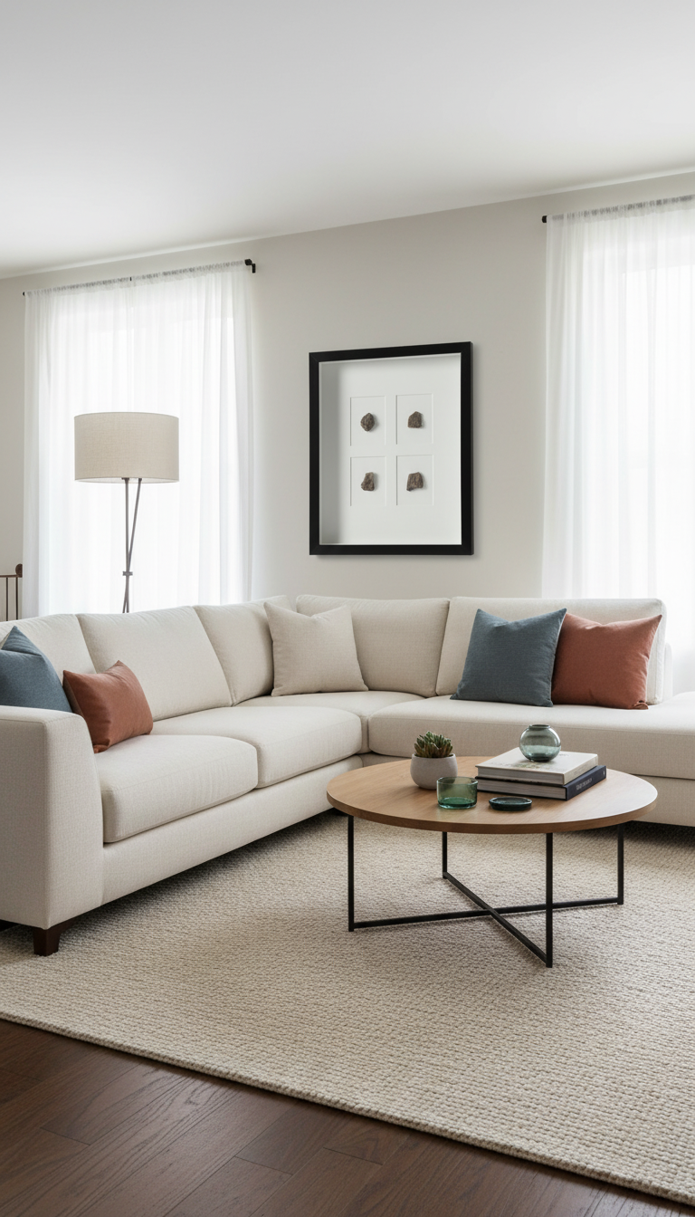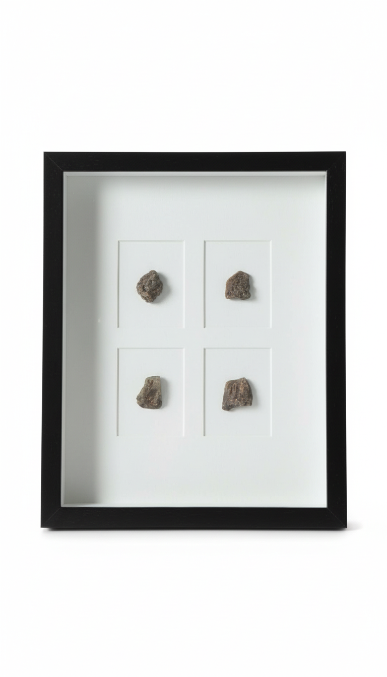 Ce tableau d’art contemporain, intitulé « Fragments Naturels », présente une composition épurée et méditative. Il met en scène quatre éléments minéraux distincts, probablement des pierres ou des morceaux de terre séchée, chacun soigneusement isolé dans un compartiment carré blanc, au sein d’un passe-partout. L’ensemble est enserré dans un cadre noir simple, qui contraste avec la texture organique des fragments et la pureté du fond blanc. L’œuvre invite à une contemplation des formes, des couleurs et des aspérités de la nature, transformant des objets trouvés en une exploration esthétique de la simplicité et de l’authenticité des matériaux bruts. Elle suggère une réflexion sur la valeur intrinsèque de ce qui est souvent négligé, élevant le fragment au rang d’œuvre d’art.