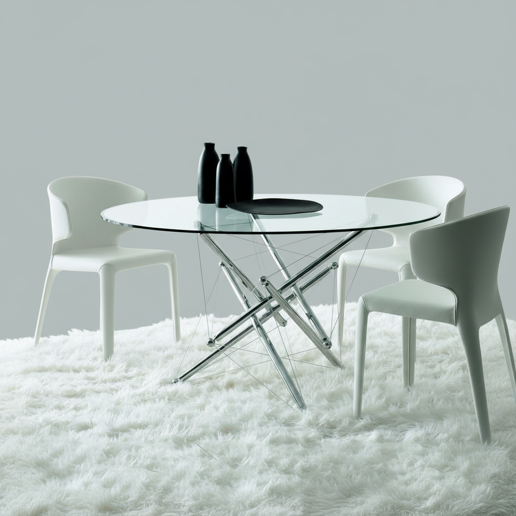 La table en bois aux bords arrondis, reposant sur un piètement contemporain en verre et métal, est le point central de la pièce. Elle est entourée de chaises design aux lignes épurées et au revêtement sobre, invitant à la convivialité. Un tapis moelleux aux tons neutres apporte une touche de douceur et d’intimité, tandis qu’une composition florale délicate et un objet décoratif abstrait ajoutent une note artistique et raffinée. La lumière naturelle filtrant à travers de légers voilages illumine l’espace, créant un cadre idéal pour des repas mémorables et des conversations agréables.