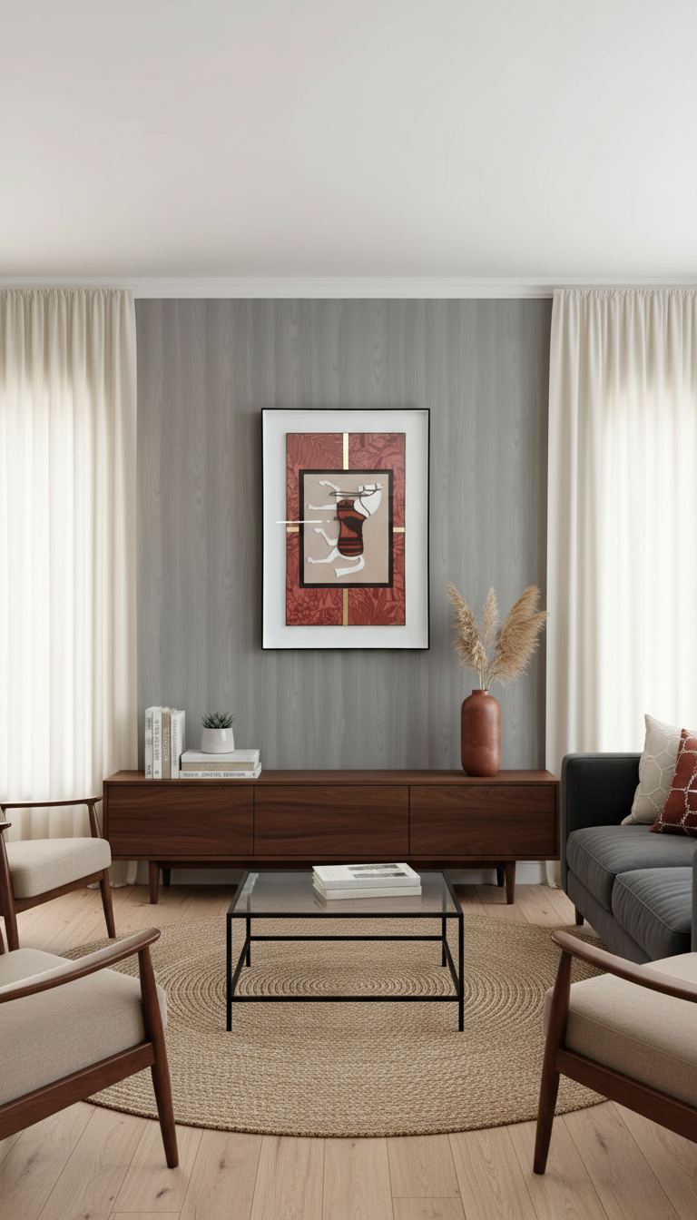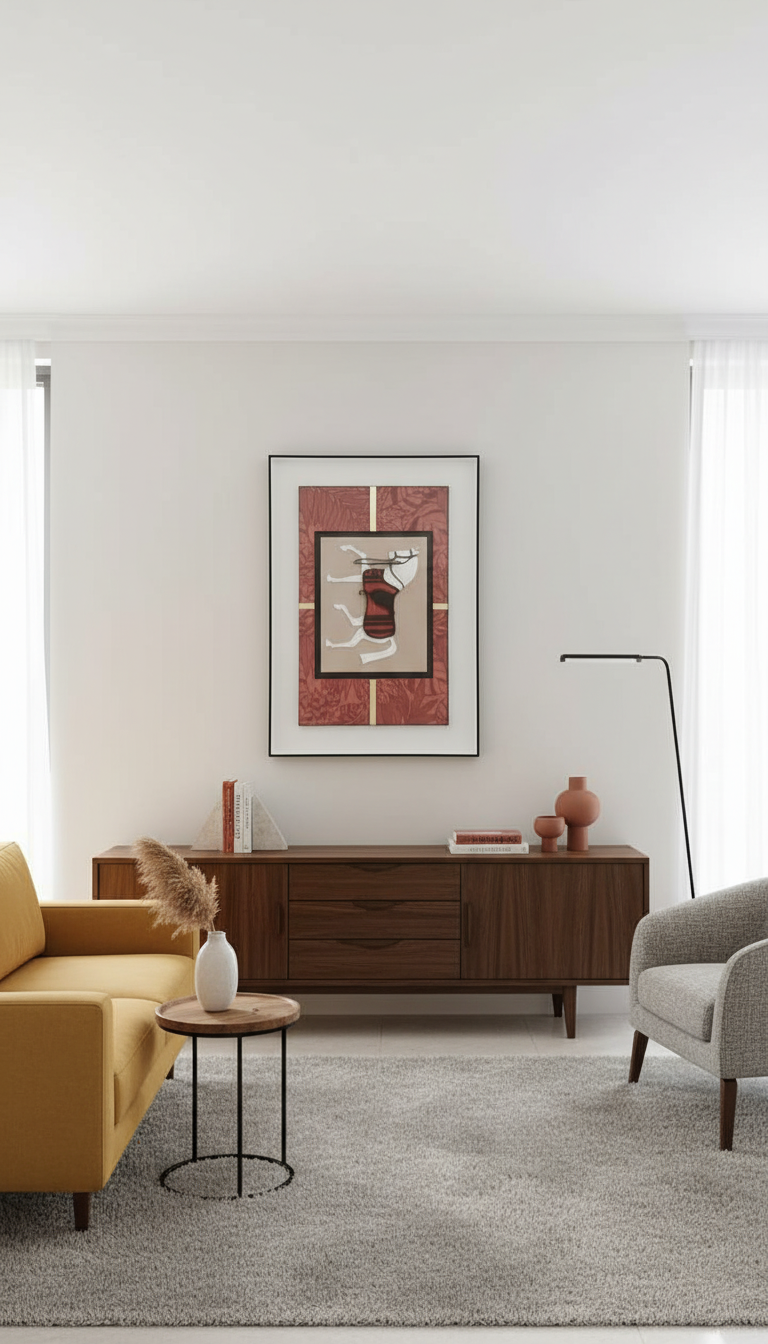 Le tableau présente une composition artistique moderne, encadrée de manière sophistiquée. Au centre, une figure abstraite et épurée se détache, rappelant par ses lignes une forme équine ou une silhouette humaine vêtue d’un corset rouge et noir à rayures horizontales. Cette figure est esquissée en blanc et noir, conférant une impression de mouvement et de légèreté. Le fond de l’œuvre est richement texturé avec des motifs de feuillage stylisé dans des nuances de rouge brique et de terre cuite, créant une atmosphère exotique et chaleureuse. Des bandes dorées traversent ce fond, ajoutant une touche de luxe et de structure. L’ensemble est mis en valeur par un encadrement multicouche : un cadre extérieur noir, un passe-partout blanc éclatant, et un cadre intérieur noir souligné d’une fine bordure dorée, qui accentue la profondeur et l’élégance de l’œuvre.