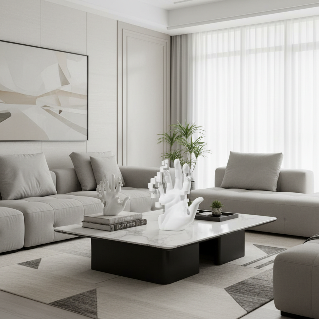 Sculpture moderne en résine blanche mate représentant une main stylisée en pixels, combinant art contemporain et design minimaliste.