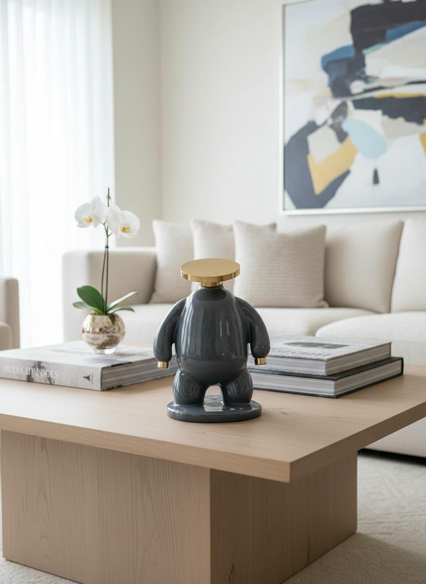 Cette œuvre d’art moderne captivante représente une élégante figurine grise, évoquant un ours, réalisée en céramique fine ou en résine. Elle se caractérise par sa forme lisse et minimaliste et un disque en or poli saisissant, faisant office de couronne, surmontant sa tête. De subtiles touches dorées sur les aiguilles rehaussent son attrait luxueux, ajoutant une touche de brillance sophistiquée. Cette sculpture de collection est conçue pour apporter une touche unique de fantaisie et d’élégance à tout espace de vie contemporain, agrémentant ainsi parfaitement étagères, bureaux ou tables basses.