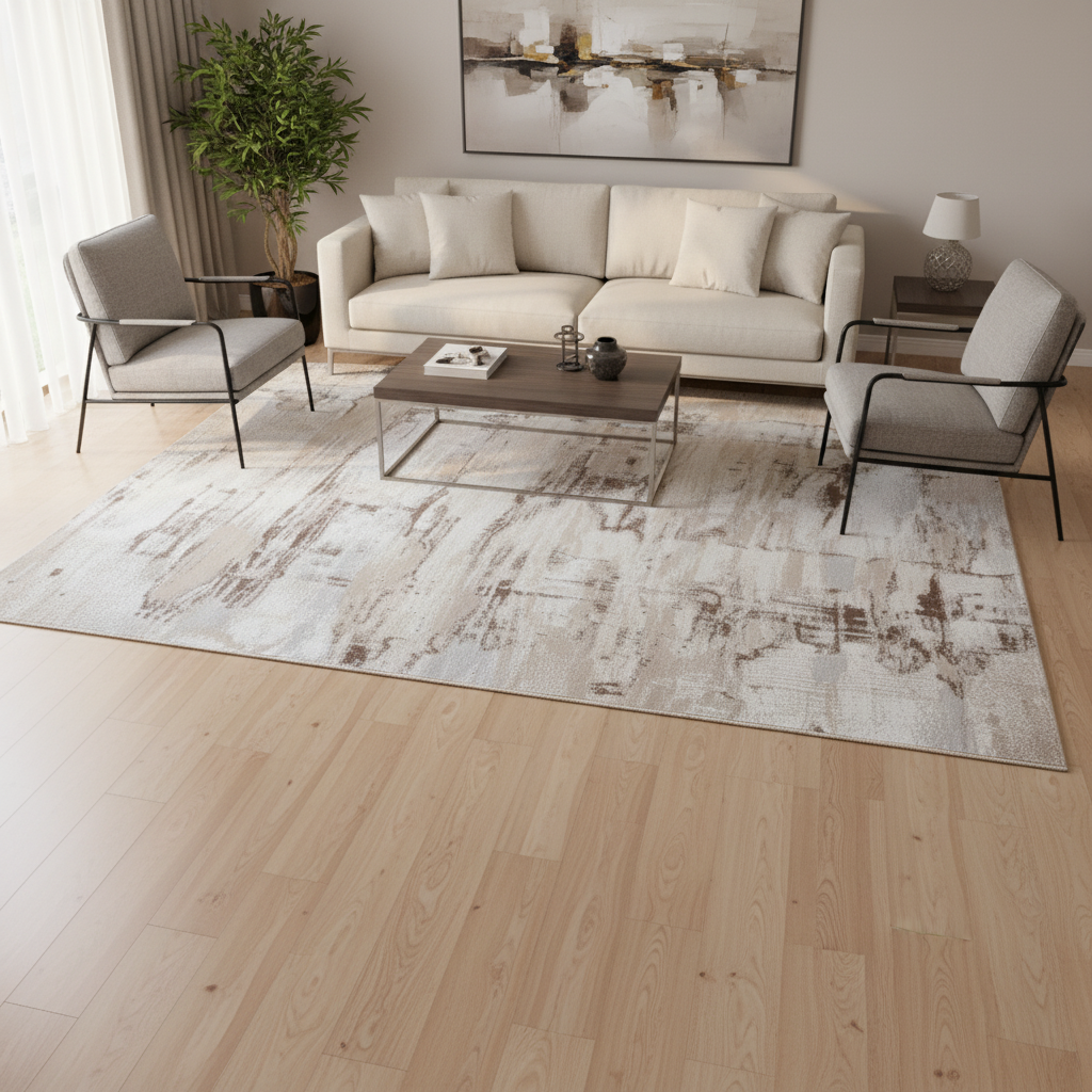 Tapis moderne au motif abstrait crème et beige, doté d’un velours doux en polyester et d’un rendu texturé élégant. Facile d’entretien et compatible avec le chauffage au sol, il convient parfaitement aux intérieurs contemporains.